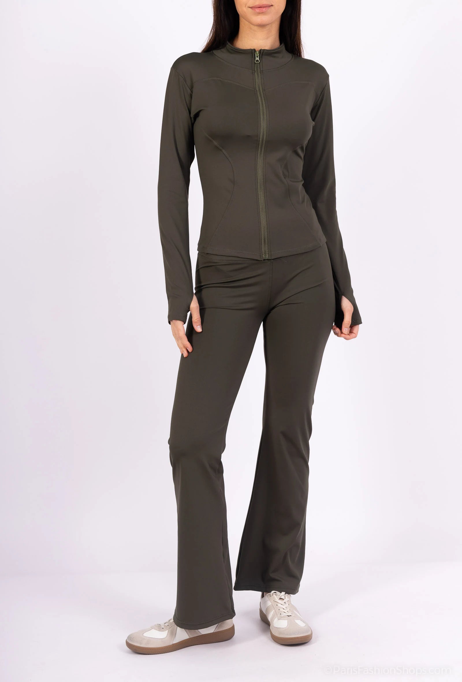 This bold set is designed for those who like to combine comfort and character. Its fitted cut enhances the silhouette while ensuring great freedom of movement. The zippered top with a high collar and long sleeves features thumb openings, adding a sporty and practical touch. The matching pants with slightly flared legs complete the set with a sleek look. Ideal for putting together a strong outfit with minimal effort.