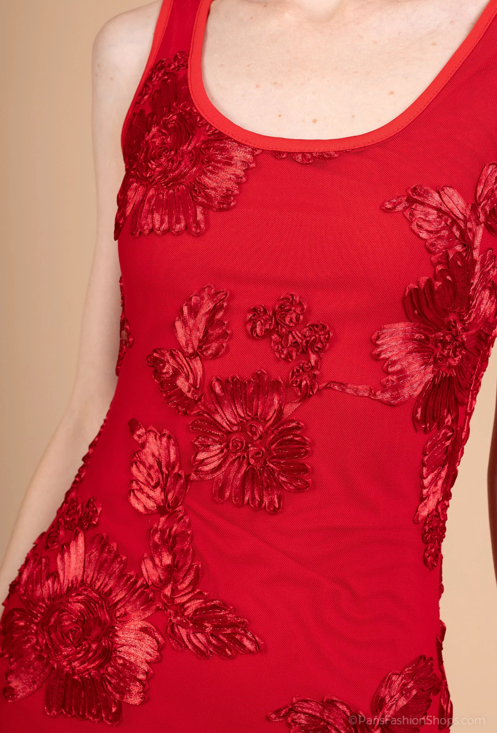 This sleeveless long dress enhances the figure with its body-hugging fit and fabric adorned with delicate floral embroidery. Its square neckline adds a retro chic touch, while the embroidered details catch the light for a refined look. Perfect for an evening, event, or formal dinner, it subtly combines glamour and modernity. Pair with heels and a clutch for an irresistible look.