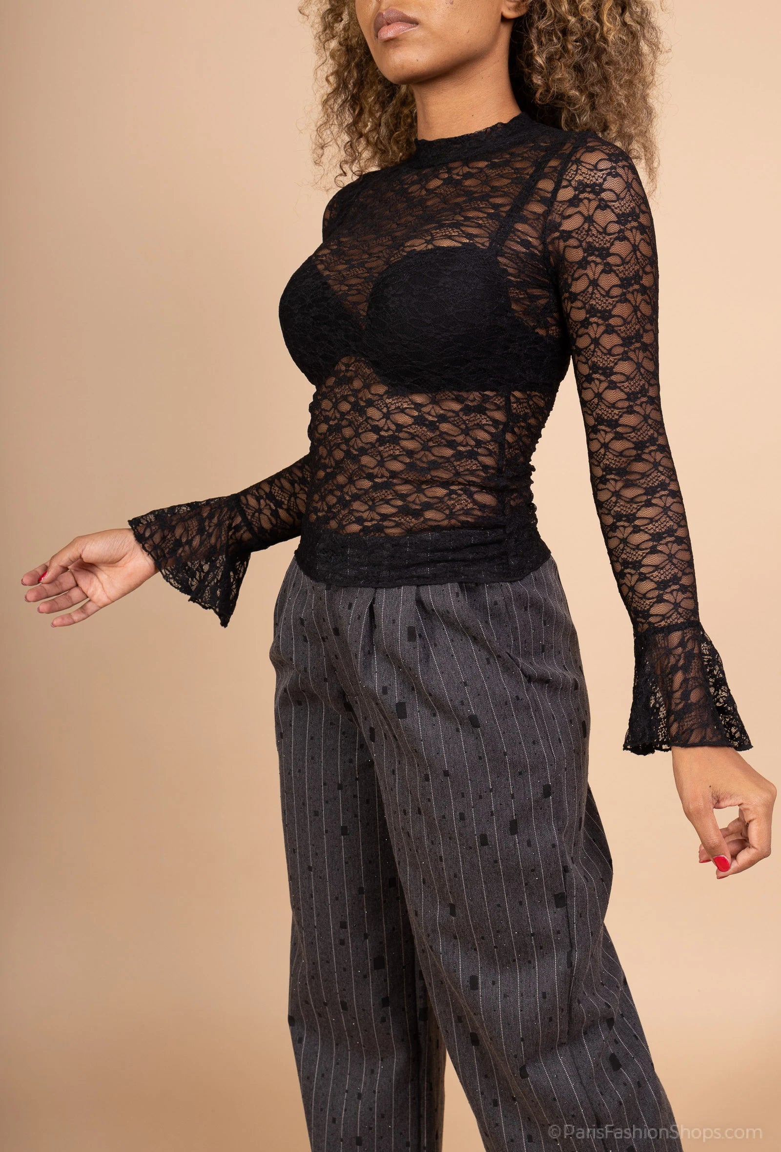 Add a touch of sensual elegance to your outfits with this sheer lace top, featuring flared long sleeves and a refined high collar. Its fitted cut enhances the silhouette, while floral patterns add sophistication. Perfect for layering over a top or bodysuit, it pairs beautifully with a skirt or pants for a chic, feminine look.