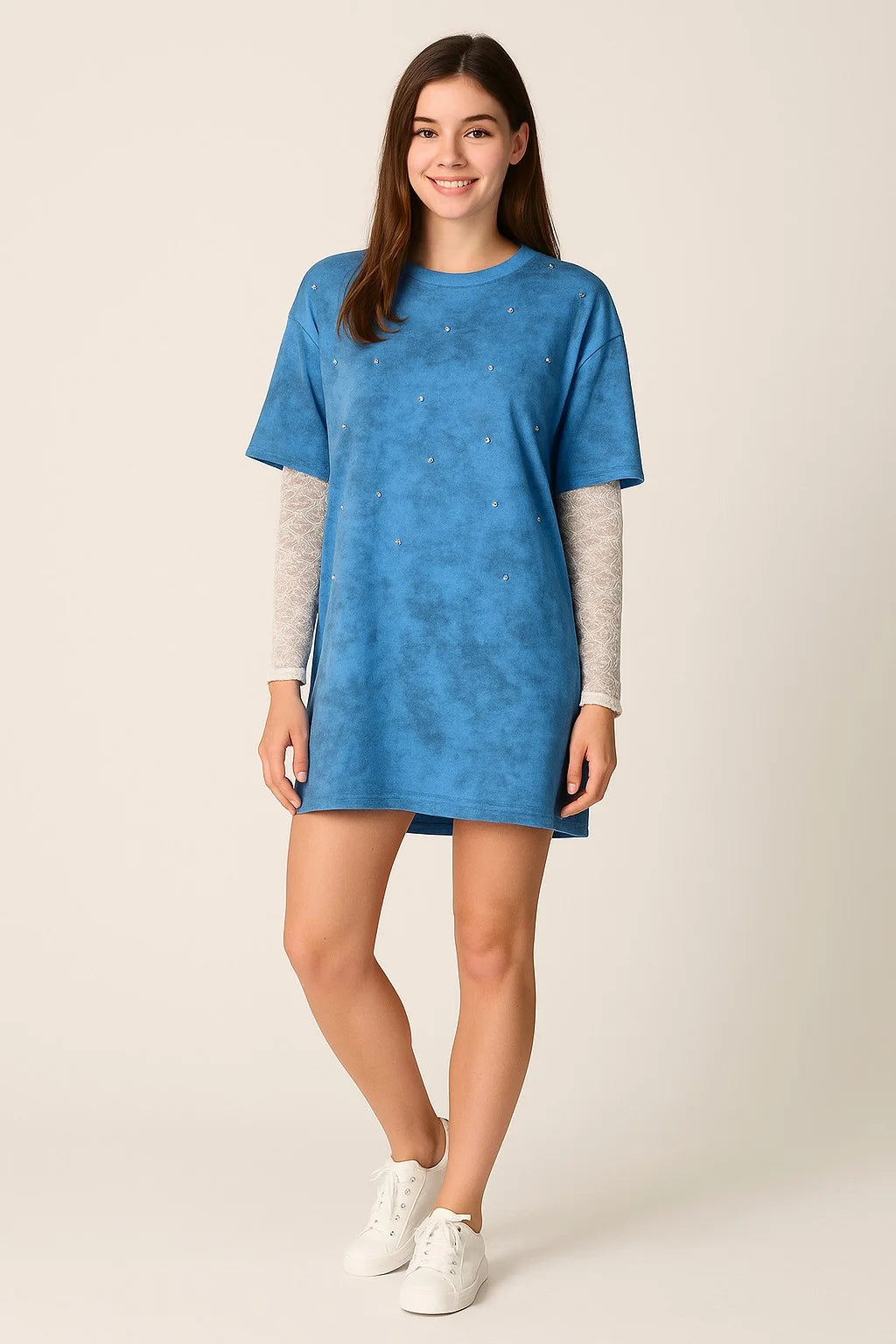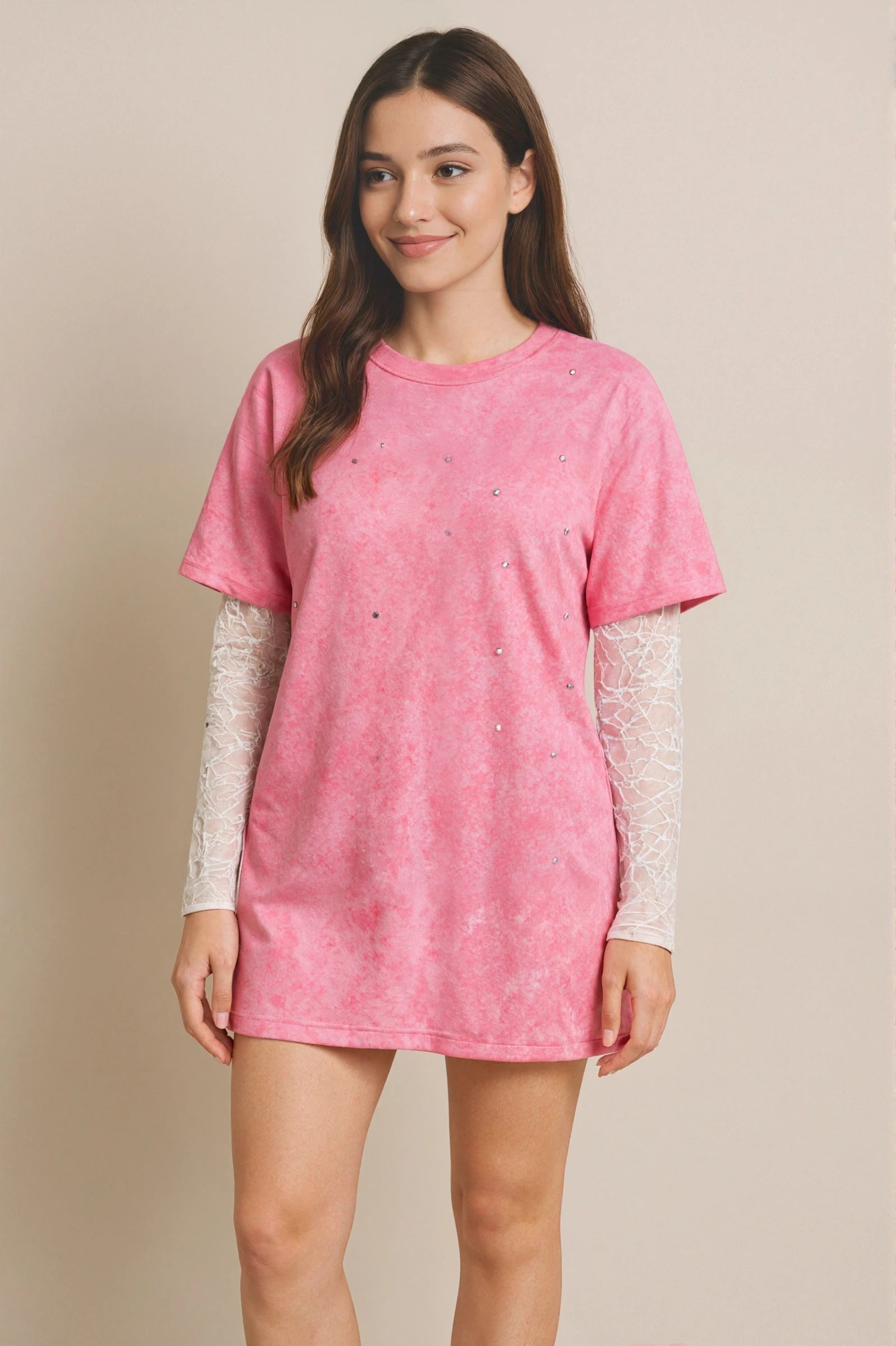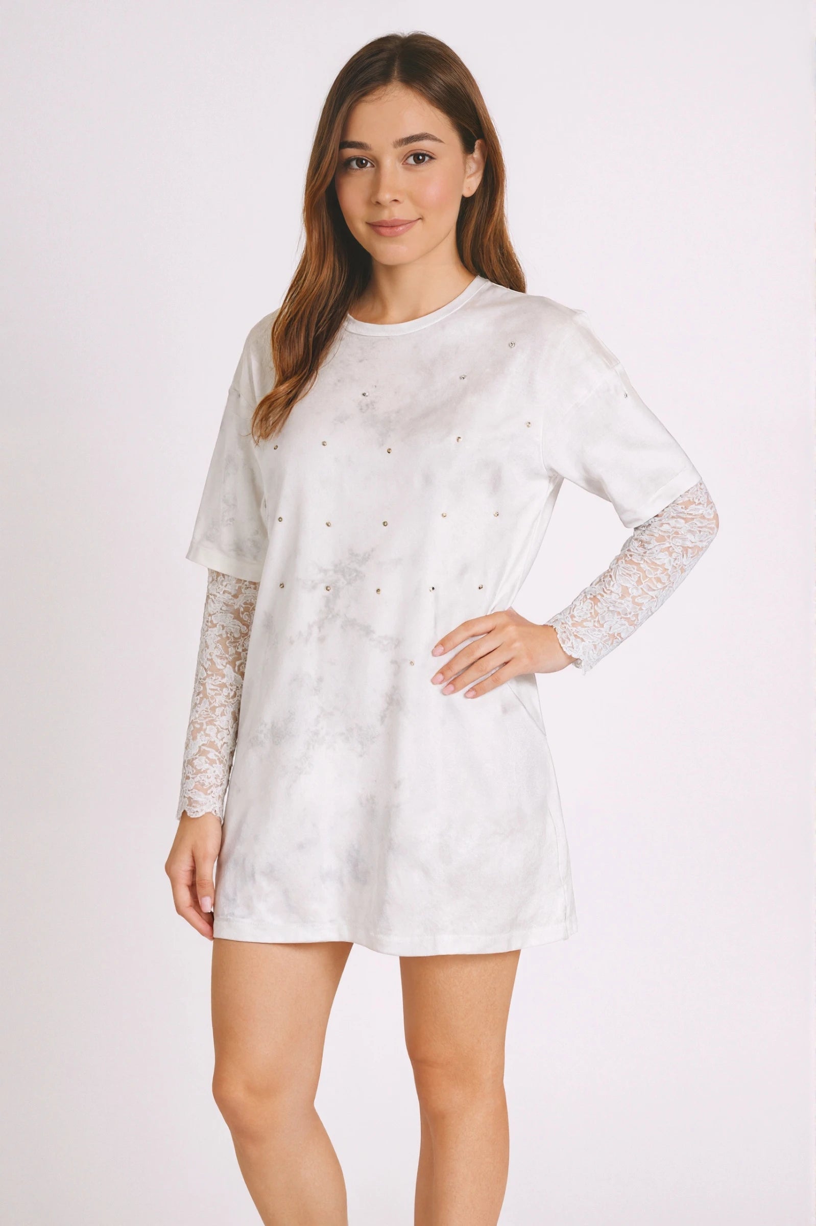 This oversized t-shirt in a casual-chic style contrasts with its loose fit and washed-effect fabric adorned with sparkling rhinestones. The long lace sleeves add a touch of romance and sophistication, making this piece a standout and original choice for layering.