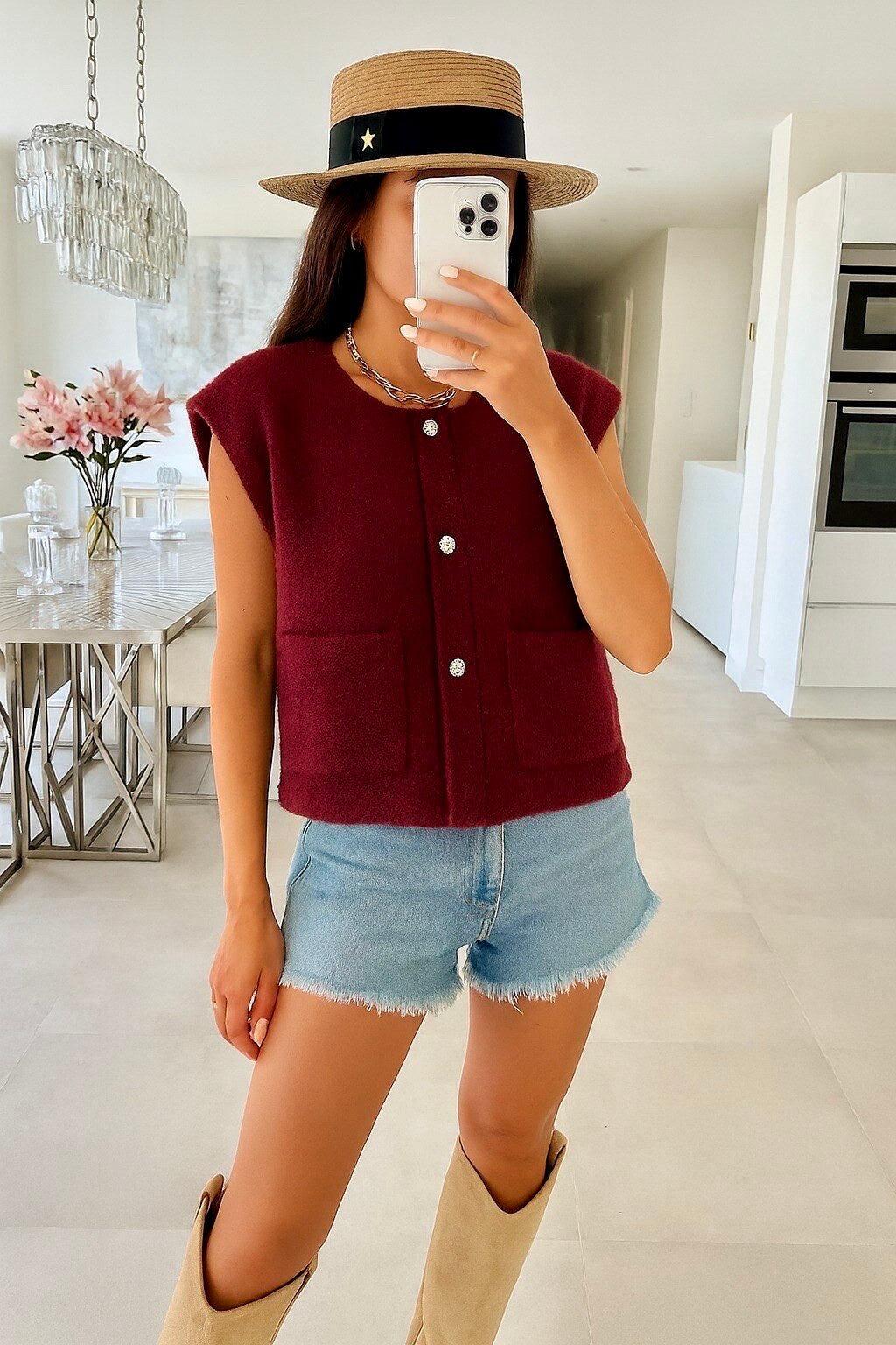 Elegant, versatile, and beautifully constructed, this Gold-Eyed Sleeveless Vest with Golden Buttons is a must-have wardrobe essential for the fall and winter seasons combining contemporary design, refined detailing, and enduring sophistication in one timeless piece.