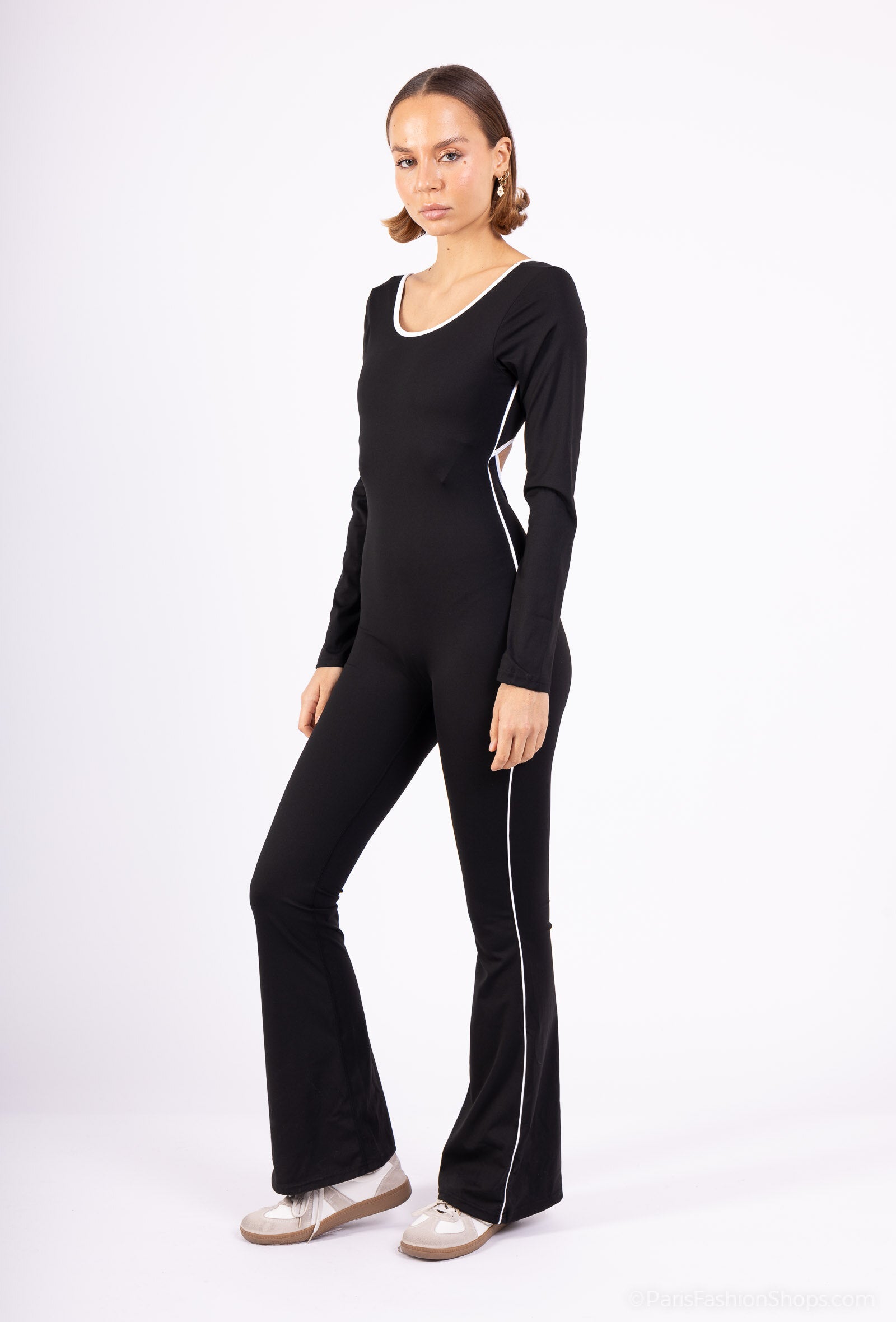 The contrasting seams and trimming visually sculpt the body and add a fashion-forward detail that sets this jumpsuit apart. The fabric is soft, stretchy, and supportive, allowing full movement without losing its shape. It gives a second-skin feel that is ideal for both active wear and stylish casual outfits.