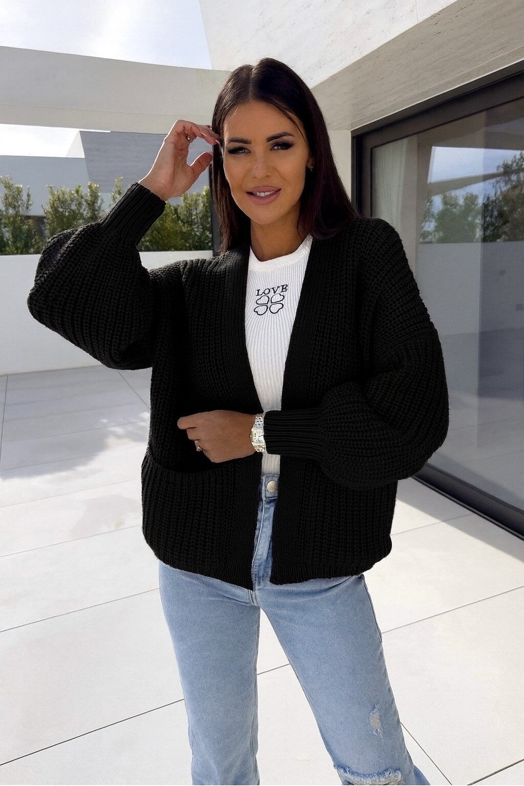 Crafted from high-quality soft knit fabric, it offers a luxurious texture and a comfortable, breathable feel that makes it ideal for all-day wear. The open-front design allows for versatile styling and easy layering over sweaters, blouses, or dresses, while the beautifully knitted pockets add both practicality and a touch of artisanal charm.