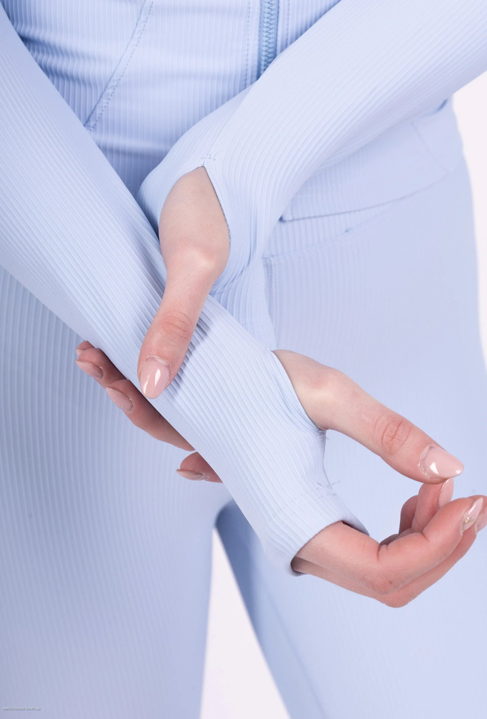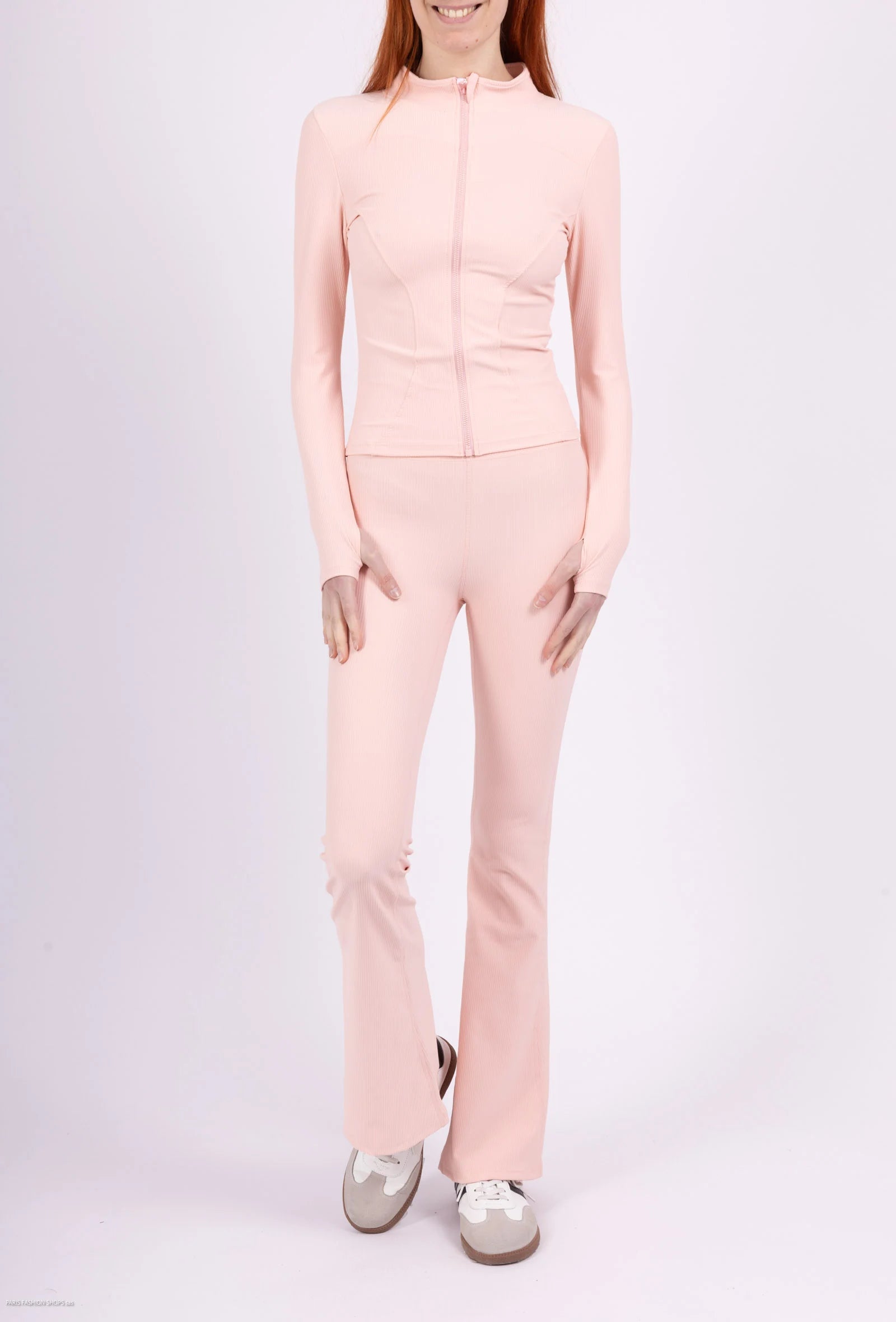 This two-piece set combines comfort and style thanks to its stretchy ribbed material and well-thought-out cut. The short zip-up jacket subtly shapes the silhouette, while the high-waisted leggings flatter the figure without compressing. The slightly flared cut at the bottom of the pants adds a touch of casual elegance. The long sleeves with thumbholes provide optimal support during movements.