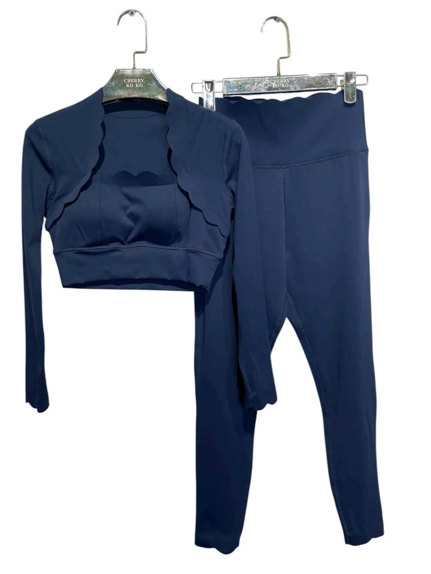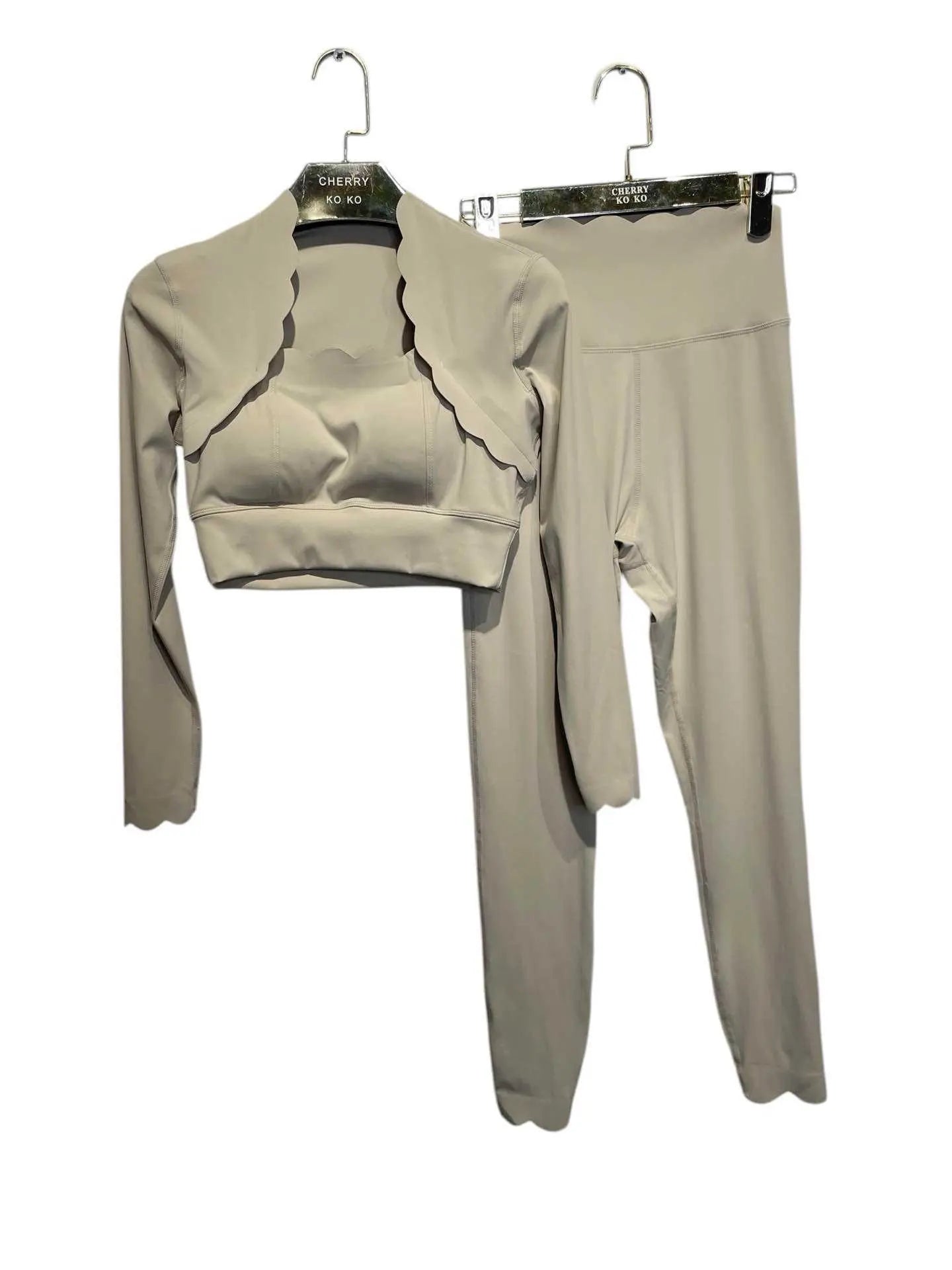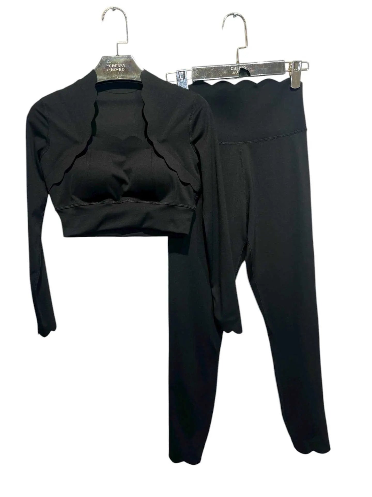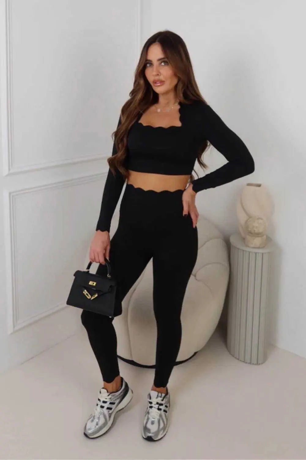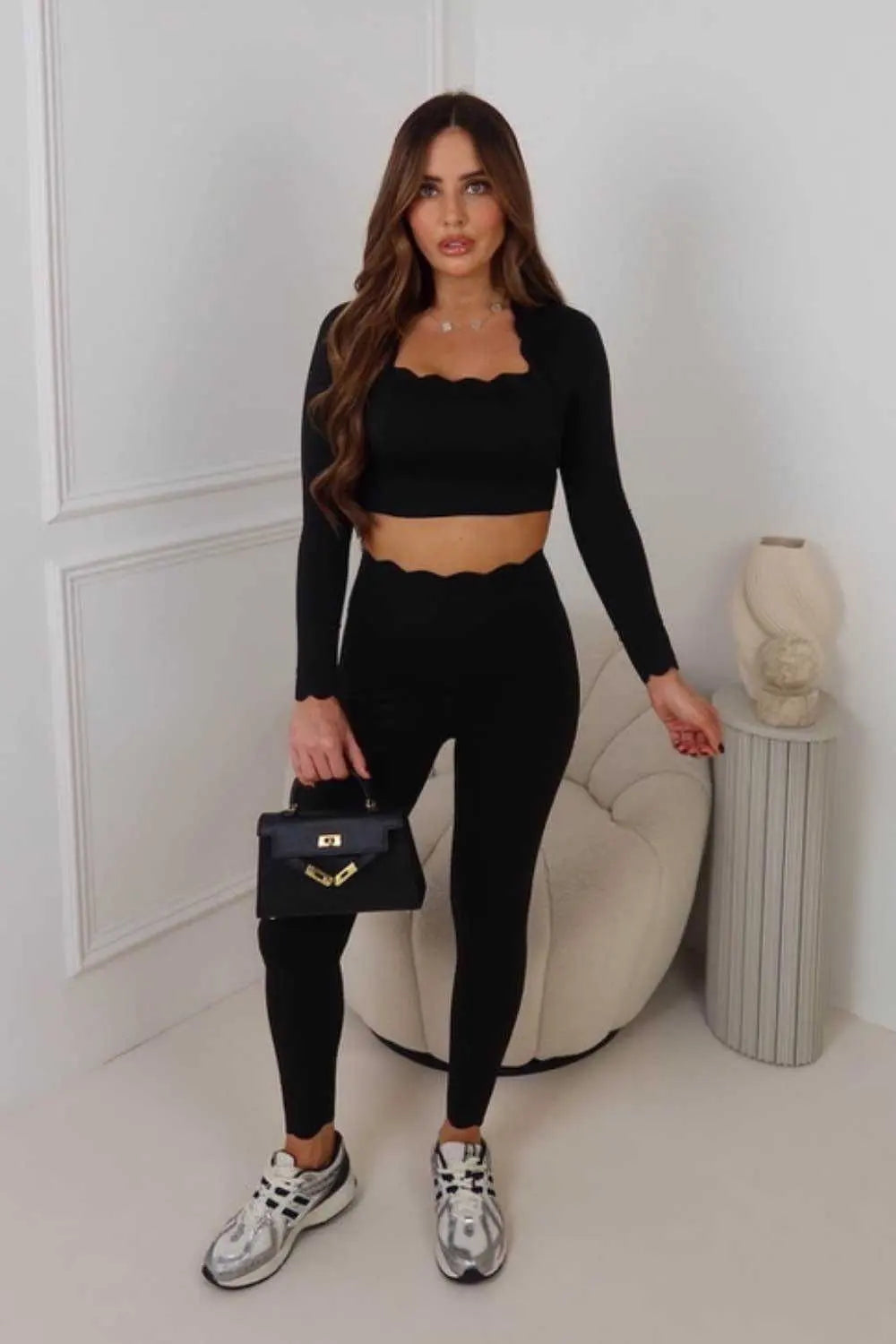 The VELENA set blends femininity and performance. Made from a shaping and stretchy technical fabric, it stands out with its wavy finishes at the neckline, sleeves, and waist. The long-sleeve crop top shapes the silhouette while the high-waisted leggings hug the curves, ensuring perfect support. Ideal for yoga, fitness, or a refined athleisure look.