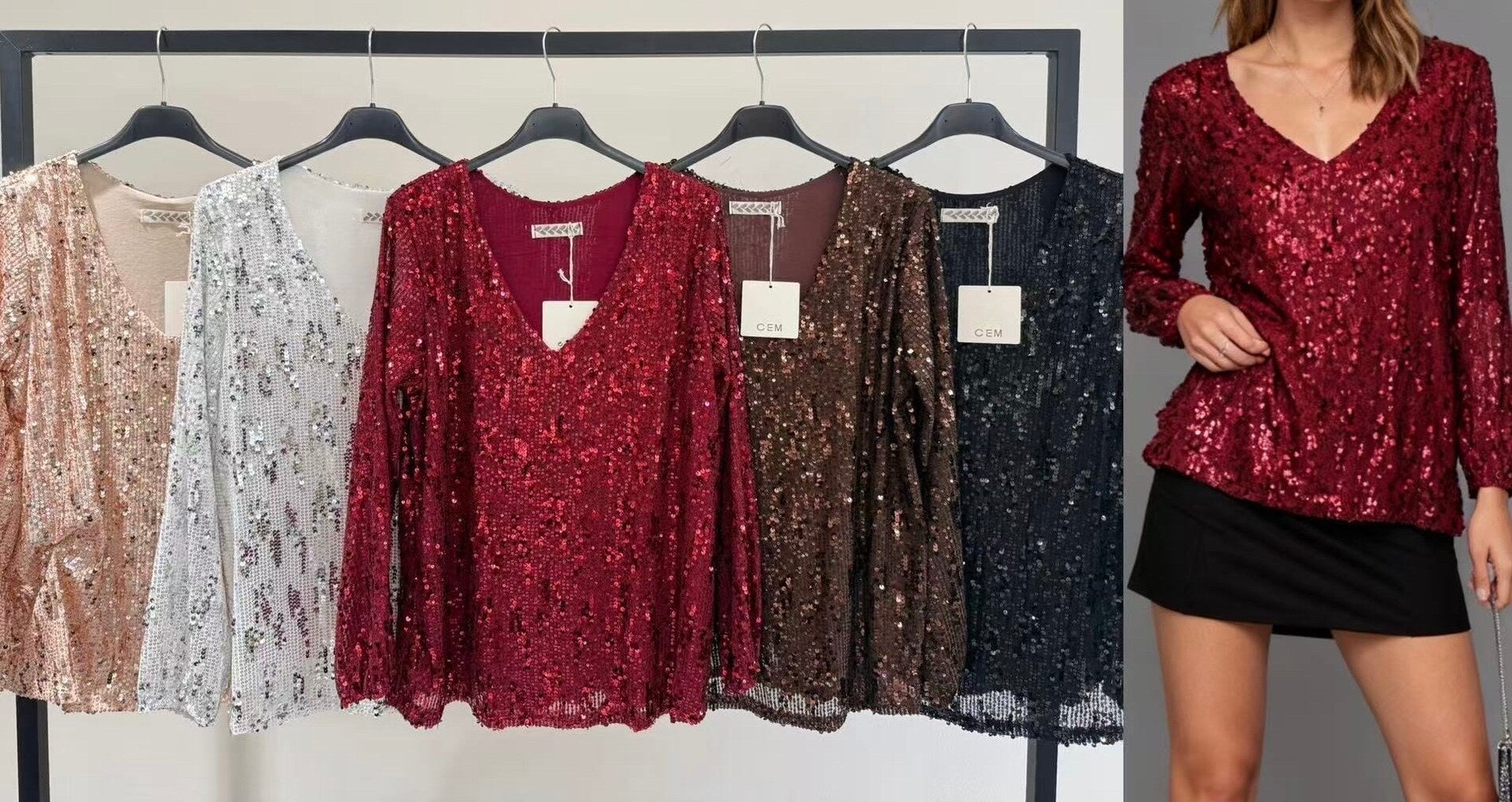 Crafted from premium sequin fabric, the blouse glimmers beautifully with every movement, reflecting light in a way that exudes refined glamour. The V-neckline adds a touch of femininity and allure, while the long sleeves provide warmth and balance, making it the perfect choice for cooler days and nights. A soft inner lining ensures maximum comfort, allowing you to enjoy the sparkle without irritation.