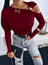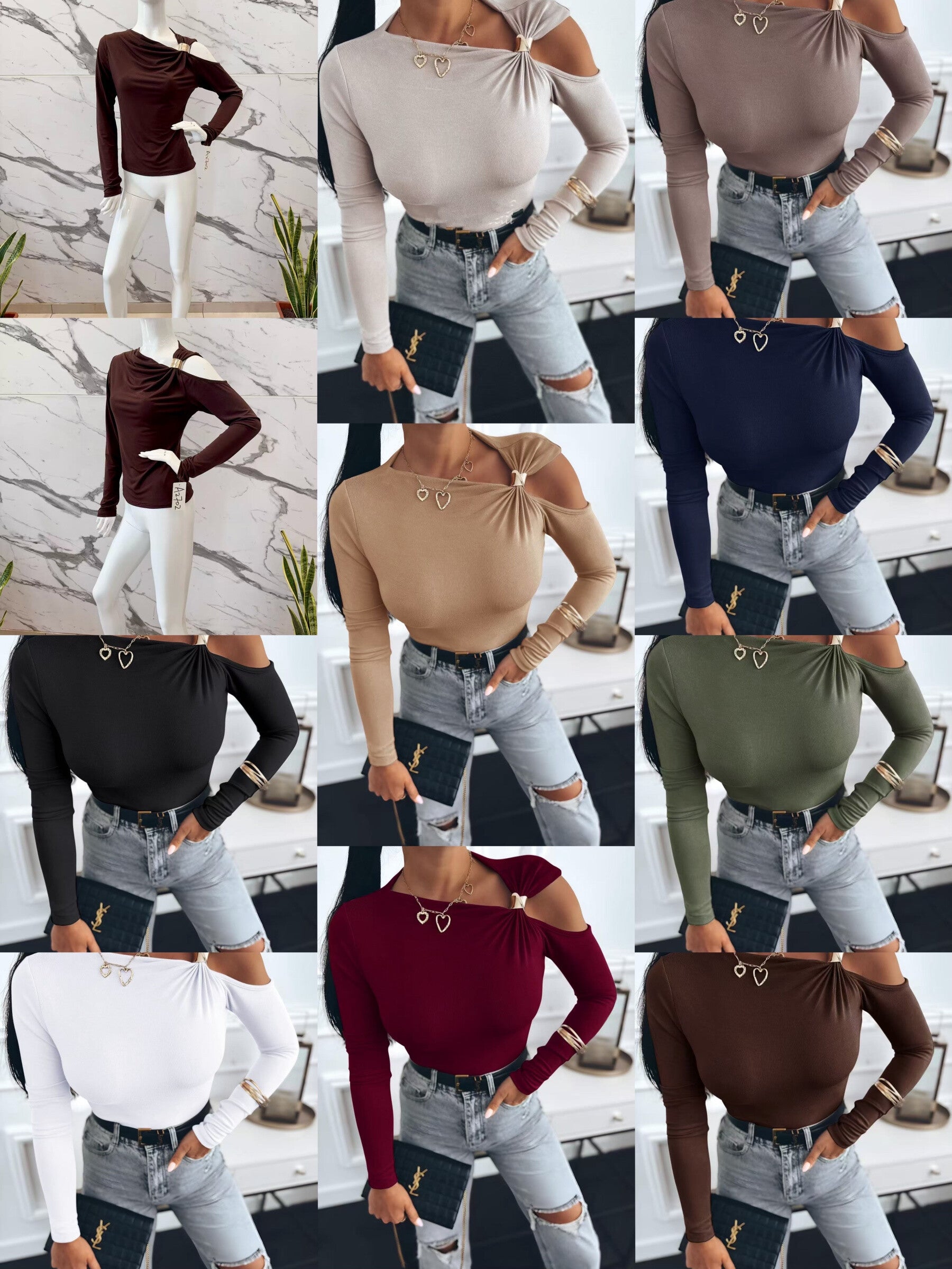 Crafted from soft, stretchable, and warm fabric, this top offers both comfort and style, making it ideal for cooler days. The asymmetrical neckline highlights your collarbone beautifully, while the bare shoulder design adds a touch of allure and femininity. The ring detail at the shoulder brings a modern, polished edge that elevates the entire look, making it suitable for both day and evening wear.