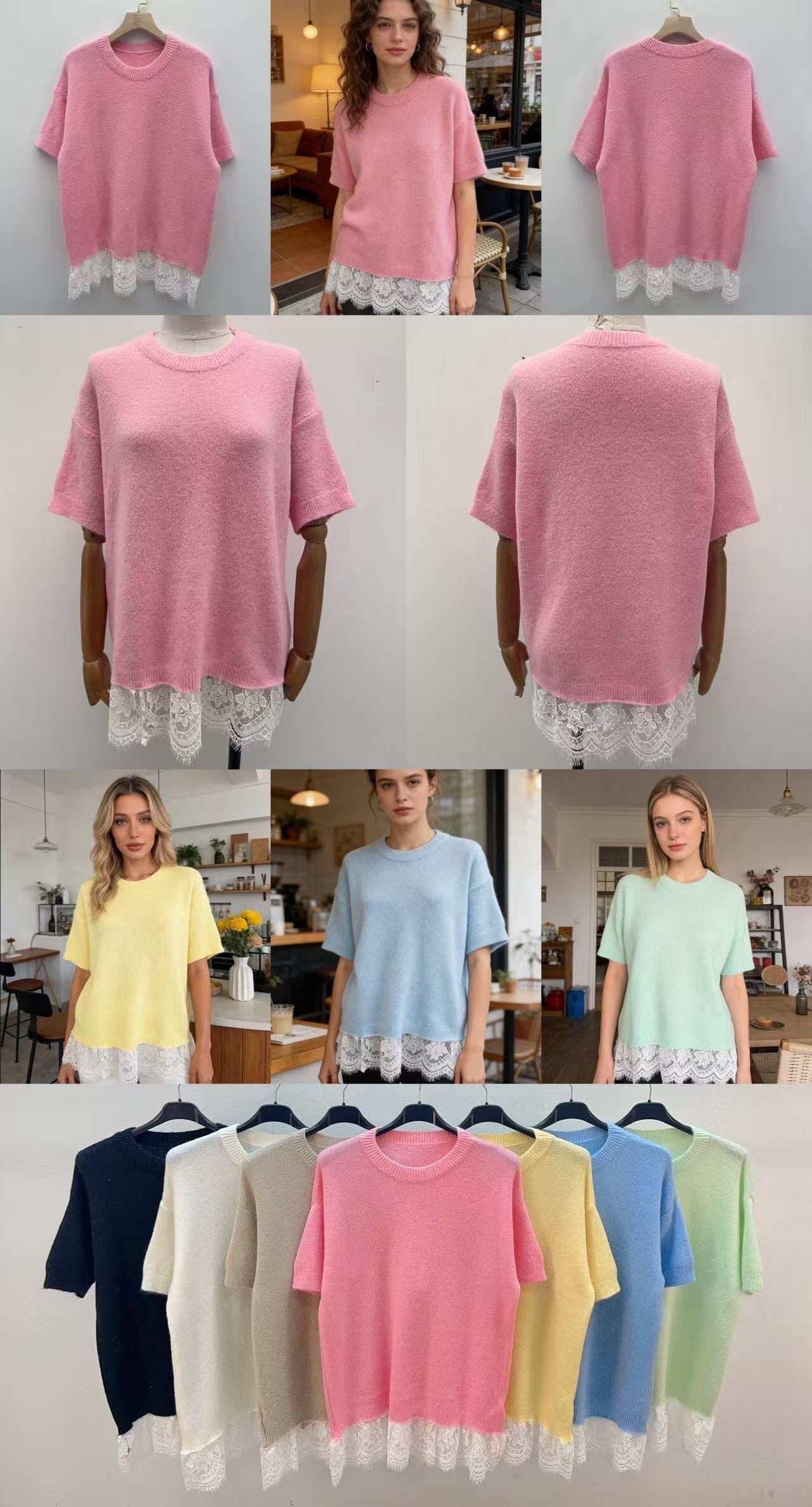 The V-neck design creates a flattering and elegant neckline, while the delicate lace detailing adds a feminine and refined touch that enhances the overall look. The short sleeves provide an airy feel and allow easy movement, making this sweater perfect for daytime wear, work settings, or casual outings.