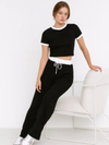 Get a contrast trouser set from Global Fashions. This contrast set includes a crop top with the same contrast elasticated waist trouser. The fitted crop top features a classic round neckline and short sleeves finished with ribbed trims, giving it a neat and polished touch. The matching trousers come with an adjustable drawstring for a secure yet flexible fit.