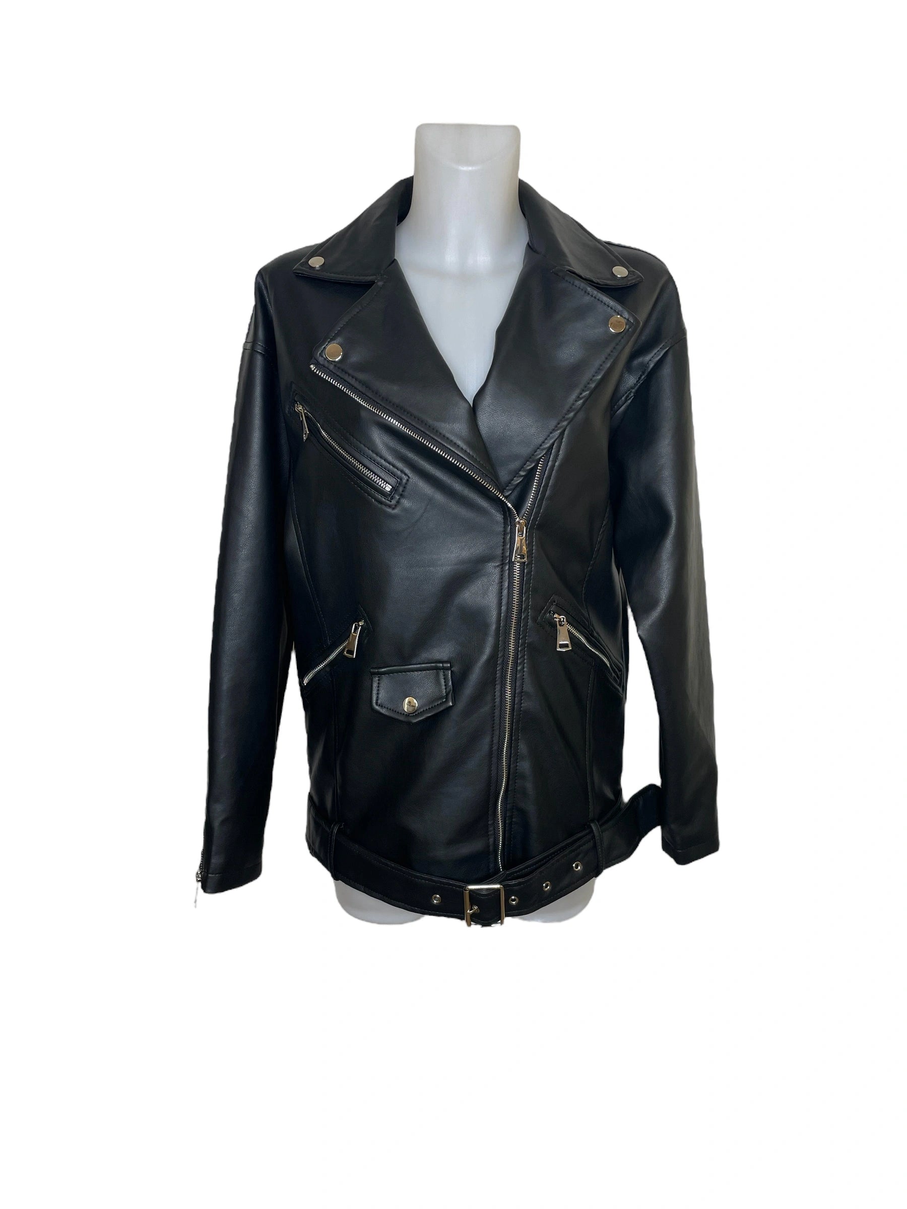 Oversized biker jacket in soft faux leather with a structured drape. Features silver zip finishes on sleeves and pockets, belted side details, and reinforced stitching. Its roomy fit and bold style create an elegant contrast with a flowy skirt or dress.