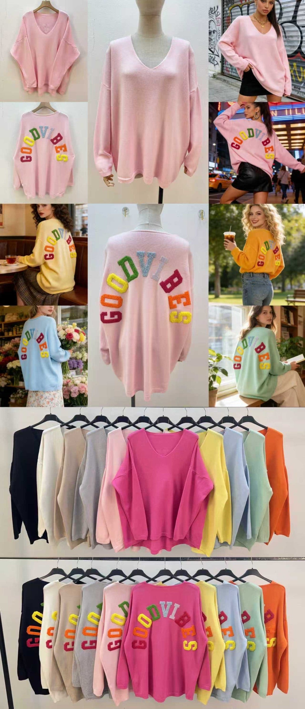 Add comfort, style, and positivity to your everyday wardrobe with our Oversized V-Neck Sweater – GOOD VIBES. This sweater is designed for those who love a relaxed fit and an easygoing fashion look that feels just as good as it looks. Made from a soft, lightweight knit fabric, it is ideal for spring and summer, offering breathability and comfort without feeling heavy or warm.