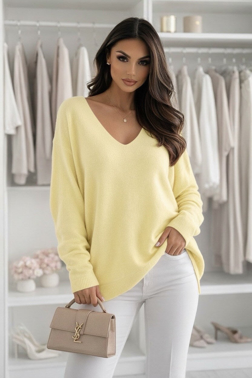 The oversized silhouette gives this sweater a modern and effortless appearance, allowing you to move freely and feel relaxed all day long. It gently drapes over the body, making it flattering for all body shapes and sizes. The V-neck design adds a feminine and stylish touch while keeping the neckline open and airy, perfect for warmer weather or layering over a tank top or camisole.