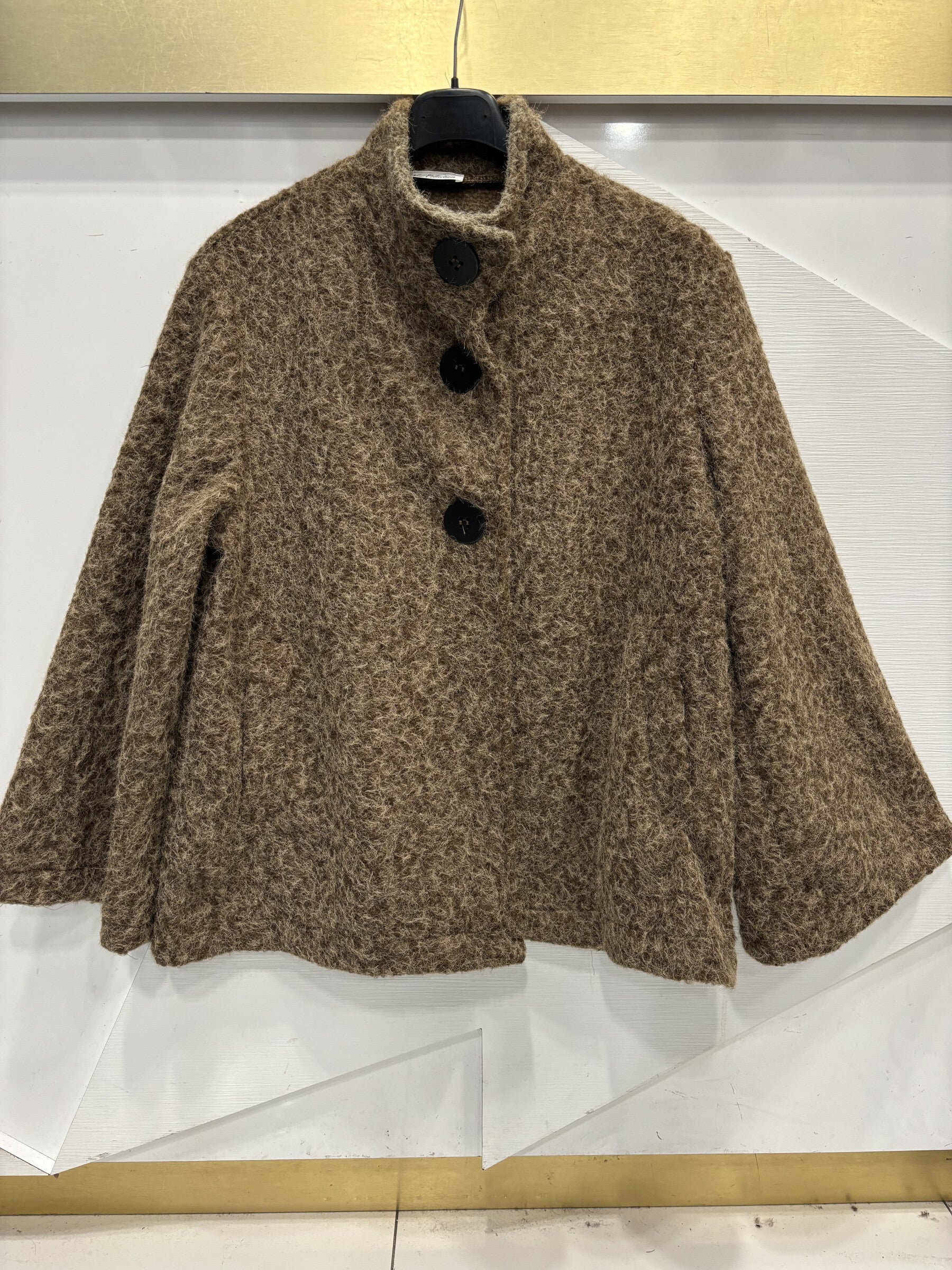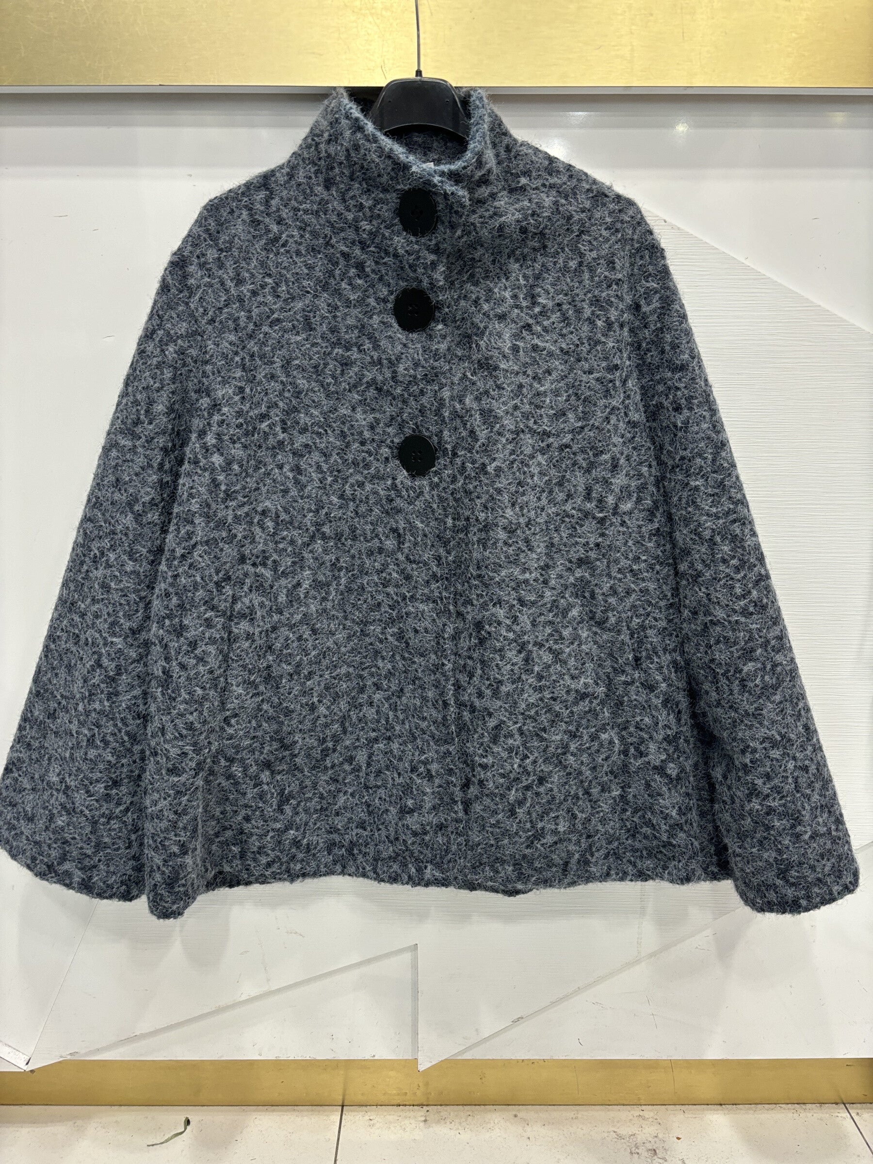 The poncho-style silhouette provides a relaxed and free-flowing fit, perfect for layering over sweaters or long-sleeved tops. The loop texture with large black “pimples” adds a modern, playful twist to classic outerwear, giving your look a unique, fashionable edge.