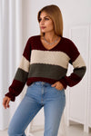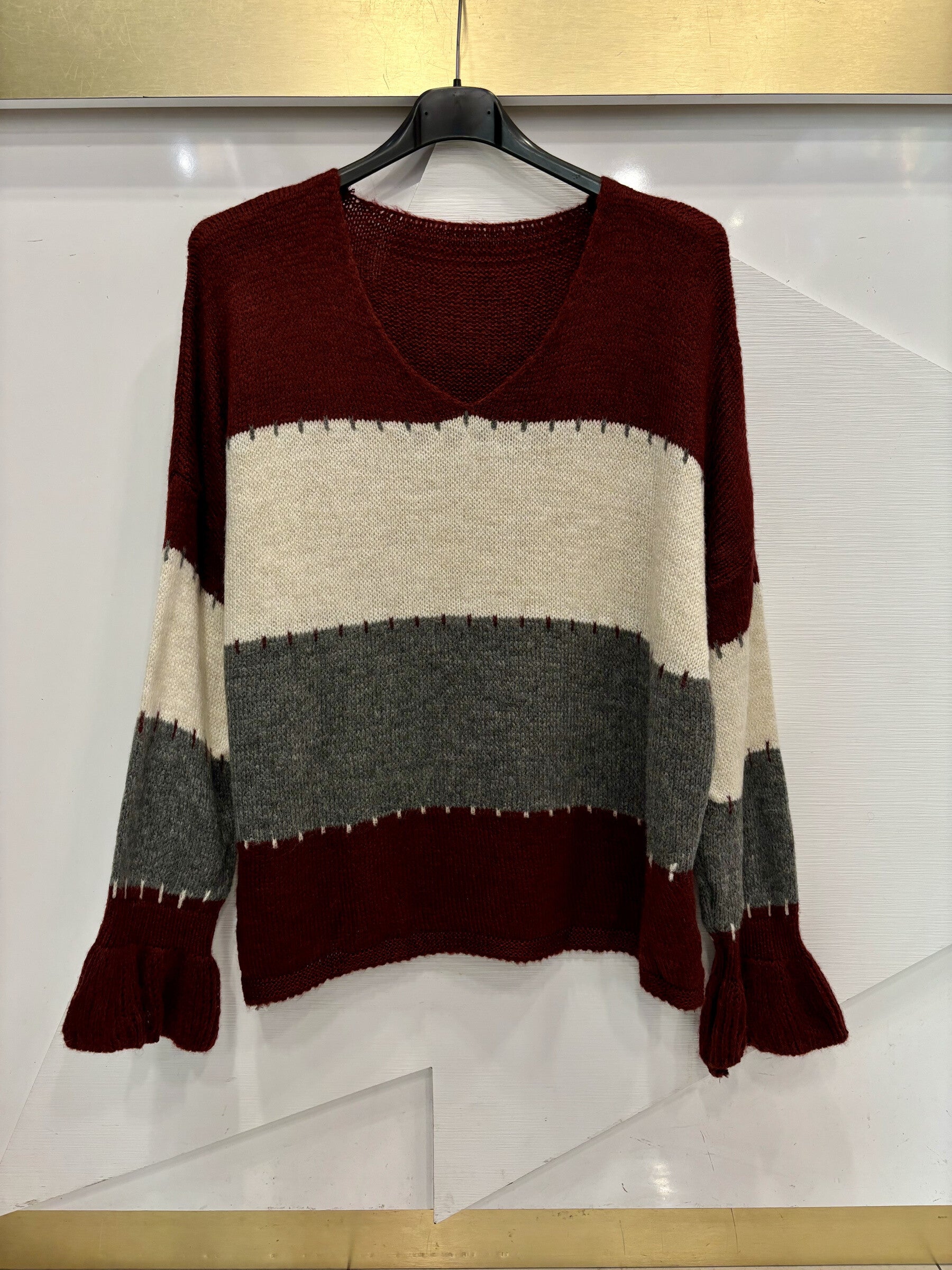 Crafted from high-quality, soft-knit fabric, it offers superior comfort and a cozy feel, ideal for layering during chilly days. The V-neckline flatters the neckline and adds a feminine, elegant touch, while the long sleeves provide warmth and a relaxed, comfortable fit. The multicolored stripe pattern introduces a playful yet sophisticated element, allowing for versatile styling across both casual and semi-formal looks.
