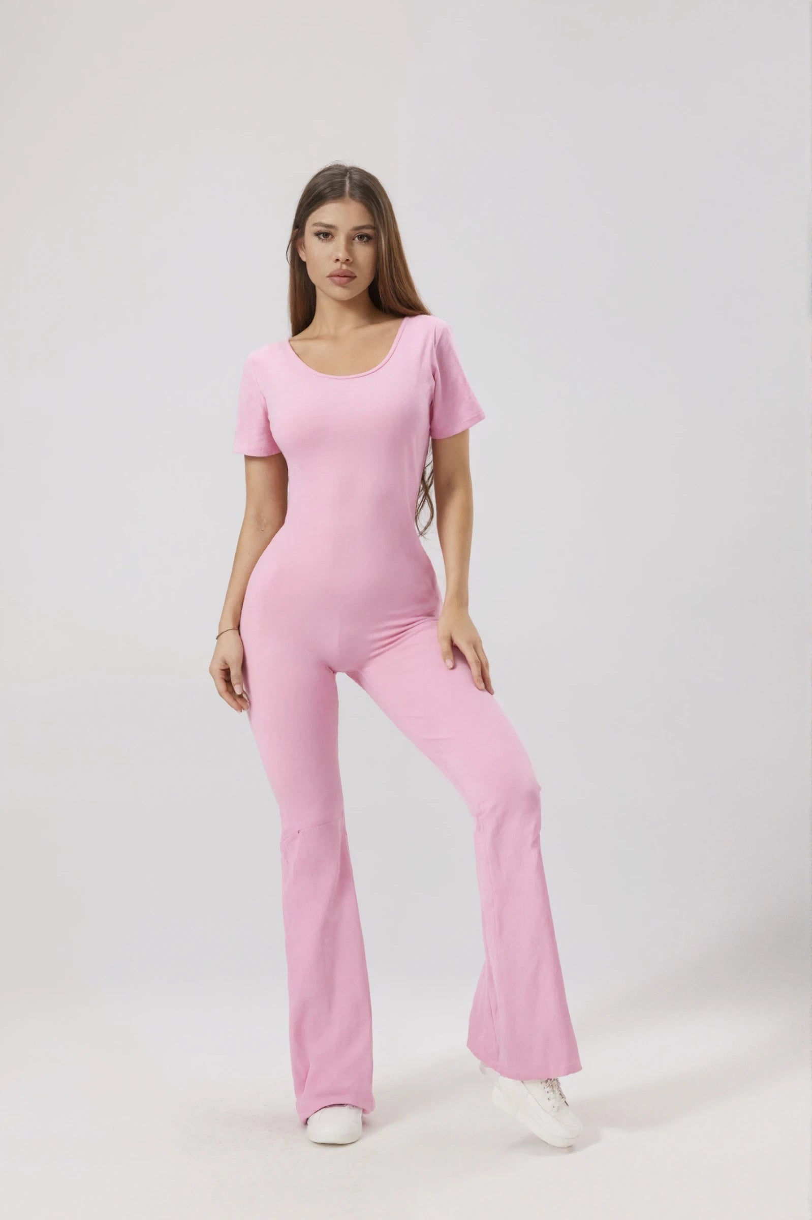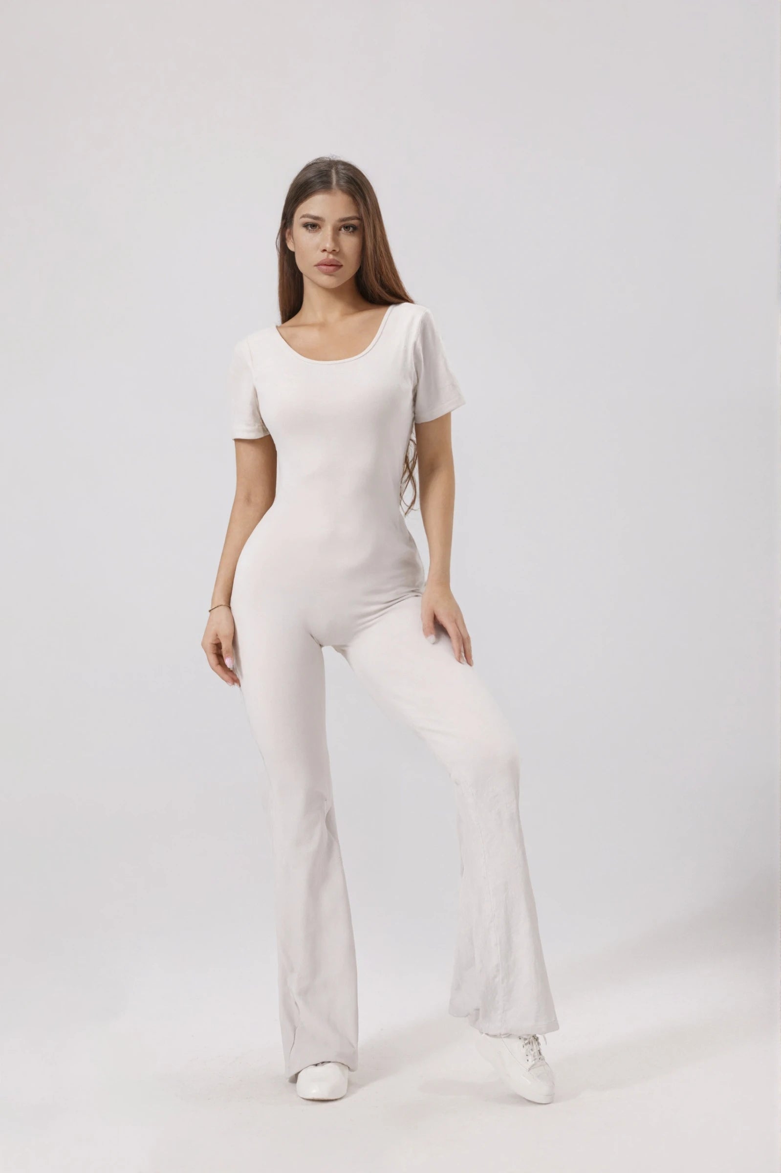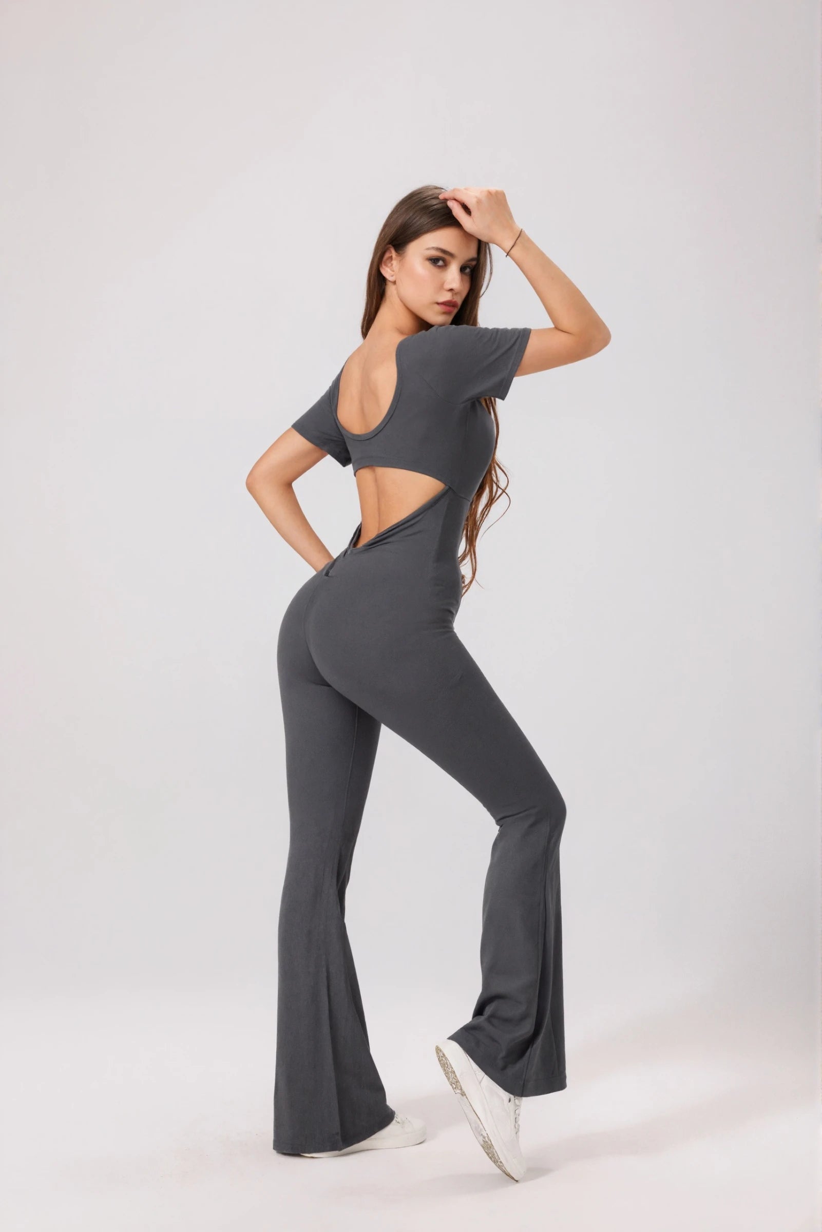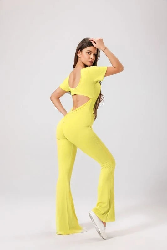 An ultra-feminine jumpsuit with shaping fabric and a sculpting fit. The V-back with ruching highlights the silhouette, while the round neckline and short sleeves ensure a sleek style.