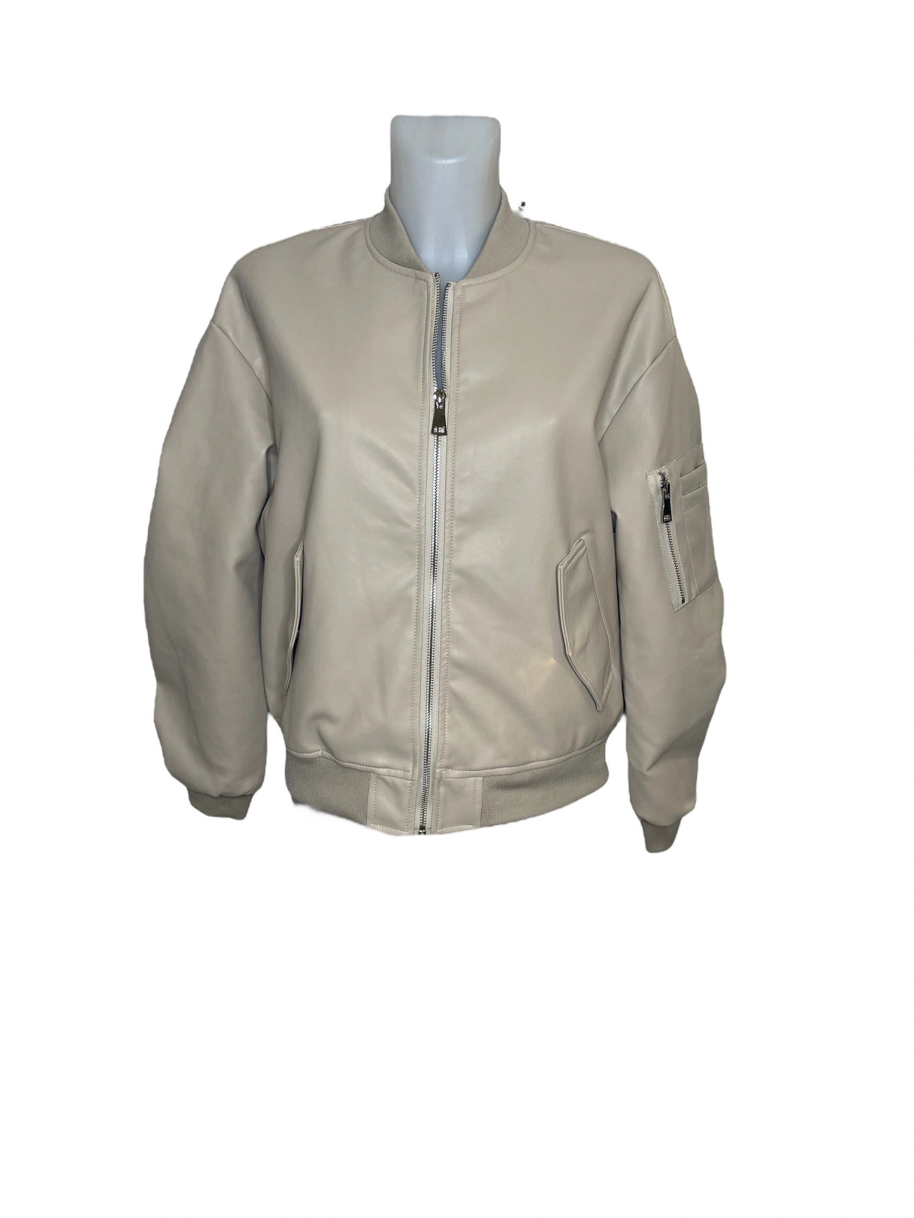 An oversized faux leather bomber with a sleek, contemporary design, perfect for shaping your fall/winter looks. Its straight cut, ruched long sleeves, and zip details on the sleeve add a modern urban touch, ideal for layering over a fitted outfit. A statement piece for a bold casual chic style.