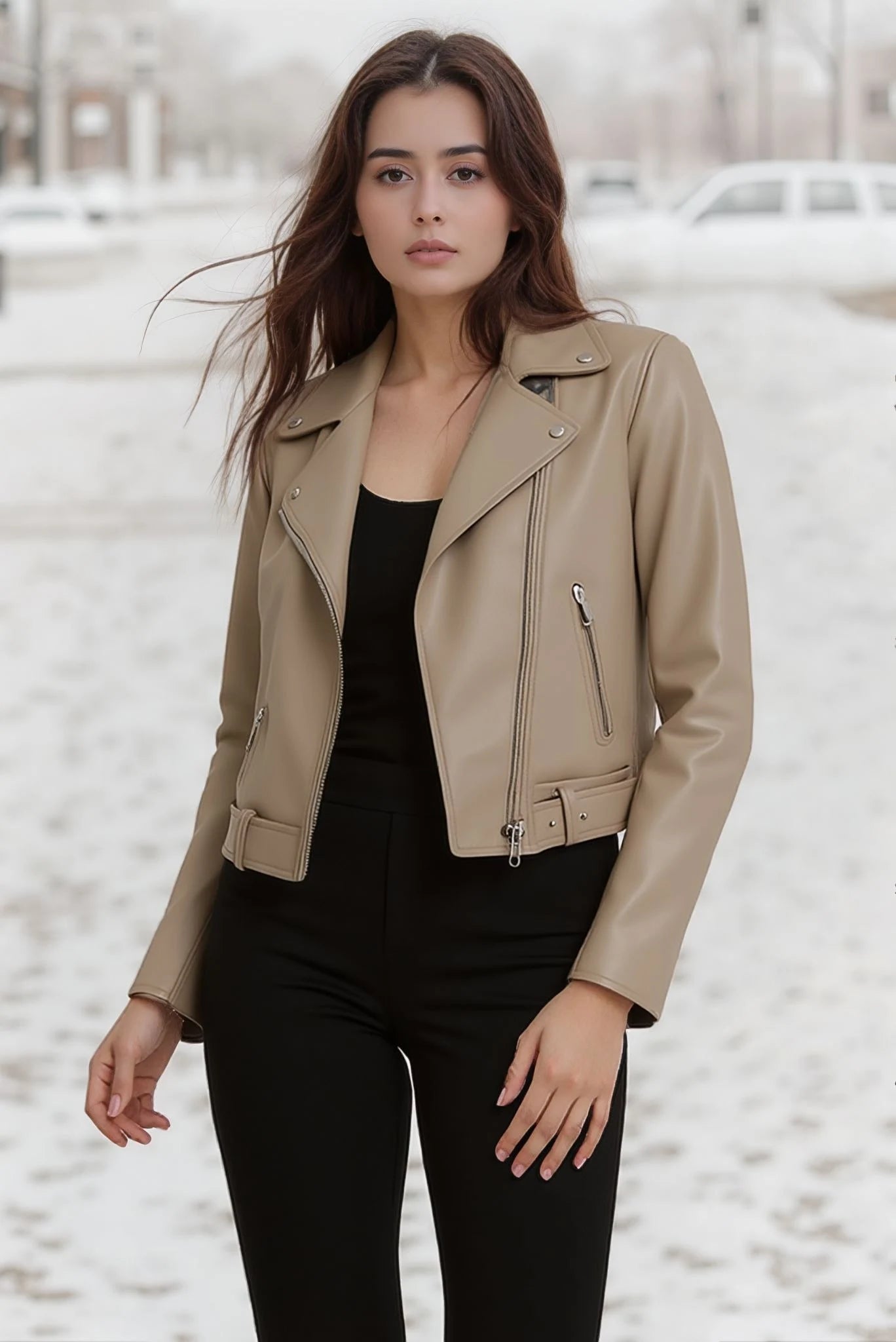 Short jacket in soft faux leather with a slightly satin finish, featuring a notched collar with snap buttons and an asymmetrical zip closure. Metal zip details on pockets and cuffs. This model has a fitted cut and a decidedly modern look.